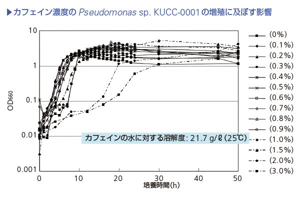 従来困難だった高濃度のカフェイン存在下でもカフェインの分解と高いクロロゲン酸類の残存を実現するシュードモナス属微生物(Pseudomonas sp. KUCC-0001)を、自然界から単離しました。その微生物の働きによって、カフェインを分解し、飲食品、保健・医薬品、化粧品等に広く利用できるカフェインの除去方法を提供できるようになります。さらに、カフェインを除去したポリフェノール含有食品の簡便な製造方法を提供することも可能です。