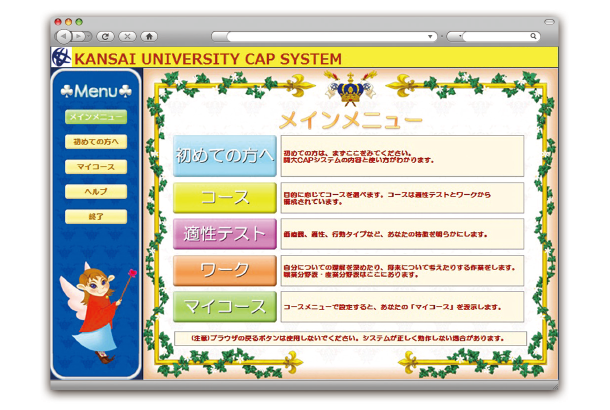 関西大学の学生は、将来の働き方・生き方について考えることをサポートするCAPシステム(Computer Assisted CareerPlanning System)を利用することができる。キャリアセンターのKICSS(関西大学インターネットキャリア支援システム)からアクセスすれば、コース、適性テスト、ワークなどのメニューが出てくる。