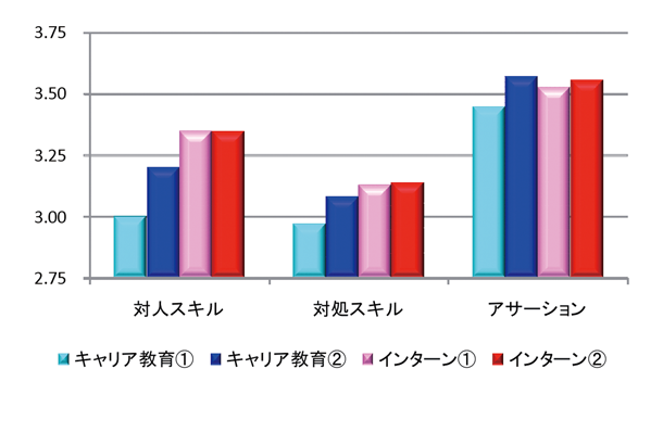 これに対して、キャリア教育科目受講生では、確かに社会的・対人的スキルが向上していますが、アサーションを除き、事後測定の値でも、まだインターンシップ実習生の事前測定の値には達していません。アサーション・トレーニングの効果は顕著であるといえますが、授業における働きかけだけでなく、日常生活におけるさまざまな体験が社会的・対人的スキルを高めるものと考えられます。
