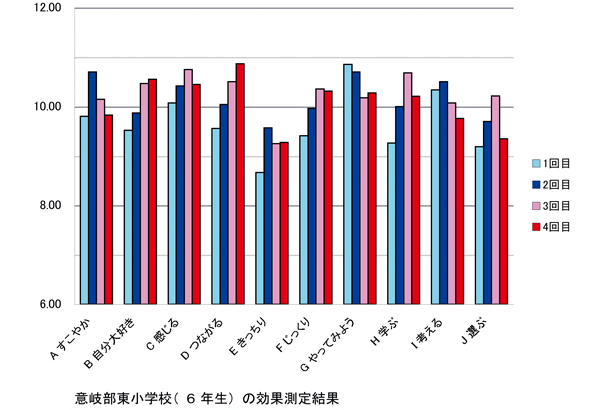 例えば、図2の意岐部東小学校6年生の効果測定結果の1回目と4回目を比較すると、最終的に得点が増加した領域は「B自分大好き」「Dつながる」「Fじっくり」「H学ぶ」の4尺度であり、得点が有意に低下した領域は見当たりません。得点が伸びた2領域については、夢づくり科のテーマ「絆・仲間~あなたが励ましてくれるから~」の取り組みを進めていくなかで、特に子どもたちに感じとり、考えを深めてほしいと願う領域であり、その働きかけの効果が反映されたと思われます。