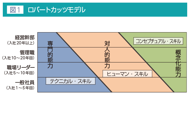 社会人基礎力はどんな能力か。ハーバード大学のロバート・L・カッツ教授は、マネージャーに求められる能力をテクニカル、ヒューマン、コンセプチュアルの3つのスキルに分類しました(図1)。テクニカル・スキルは業務を遂行する上で必要な専門知識や処理能力。ヒューマン・スキルはリーダーシップや交渉力、調整力、プレゼンテーション力など。コンセプチュアル・スキルは論理思考力、問題解決力など。この中のヒューマン・スキルやコンセプチュアル・スキルが社会人基礎力にあたります。