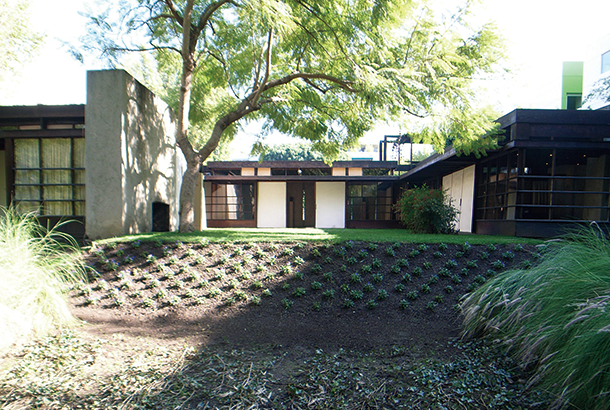 シンドラーは1922年にロサンゼルスに自邸を建てました。それまでのカリフォルニアの建築の流行はスパニッシュ・コロニアルといって、分厚い壁で屋外の自然から室内を守るという建築でした。しかし、シンドラーは雨の少ない温和な気候を生かし、パティオに面した部分には完全に取り外すこともできる引き戸を採用し、室内の床と屋外のレベルを合わせて、内部と外部の差異を無くしました。暖炉も屋外に設置し、夜は外で寝ましょうと寝室の代わりに「スリーピング・ポーチ」を屋外に設け、機械的な暖房施設も取り入れませんでした。