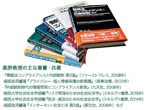 情報通信技術(ICT)の発展に伴い、ビッグデータと個人情報保護の問題、クラウドコンピューティングと越境データ問題など、現行法では対応が困難なさまざまな問題が顕在化している。わが国の情報法は、このような社会的課題への対応と国際的整合を目的に大きく変化しようとしており、企業における情報法コンプライアンスへの取組は、今や経営上の最重要課題の一つと言っても過言ではない。髙野一彦教授は新しい情報法制への提言を行うとともに、企業における新たなコンプライアンス体制を探求している。