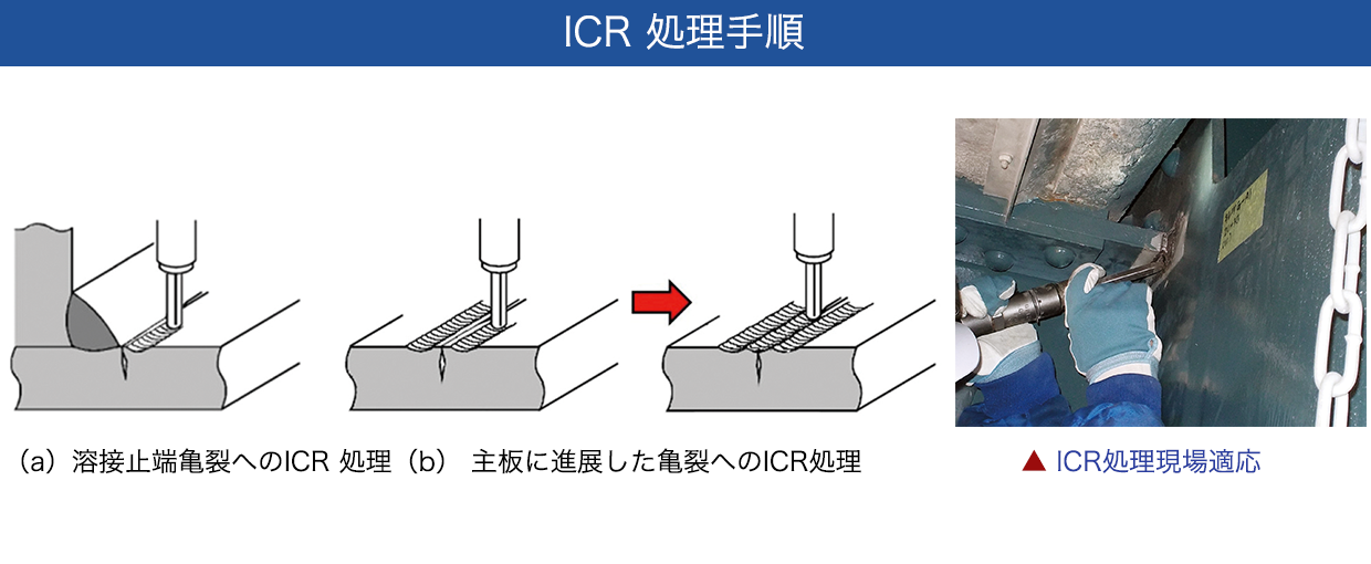 大きく分けると2つあります。1つは鋼橋の疲労亀裂近傍を叩いて、亀裂表面を閉口させる技術。ICR処理(Impact Crack ClosureRetrofi t Treatment)といいます。これは、名古屋大学で私が助教をしていた時に、山田健太郎名誉教授と開発した工法で、比較的小さな亀裂に対しては、亀裂の表面を叩くことで、亀裂の進展を遅延させる、場合によっては完全に停止することができるというものです。