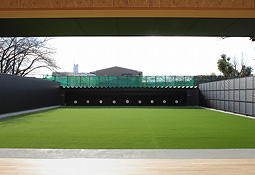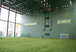 屋内練習場は、第4学舎3号館の建物東側の1階から4階までを吹き抜けにし、全面に人工芝を敷設した全天候型の施設です。