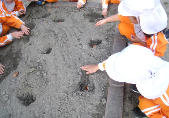 チューリップの球根を植える年少児